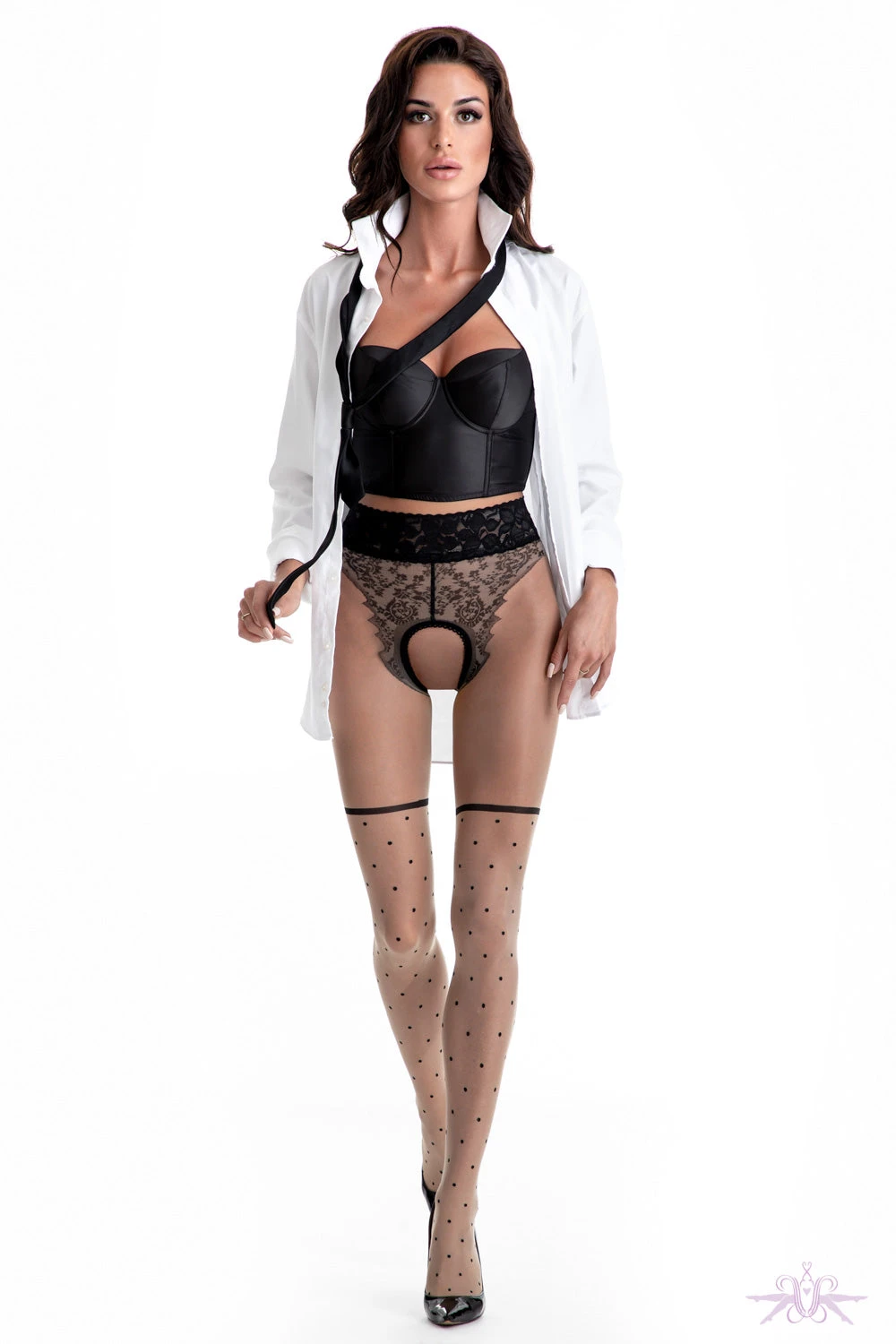 A very seductive pair of gloss crotchless tights. These sheer 30 denier nude tights have a contrasting black polka dot detail on the lower leg with a faux hold up top. The design stops at the top of the thigh and then the panty area is finished with an ornate floral design and a lace waistband to enhance the derriere. Also available in black.