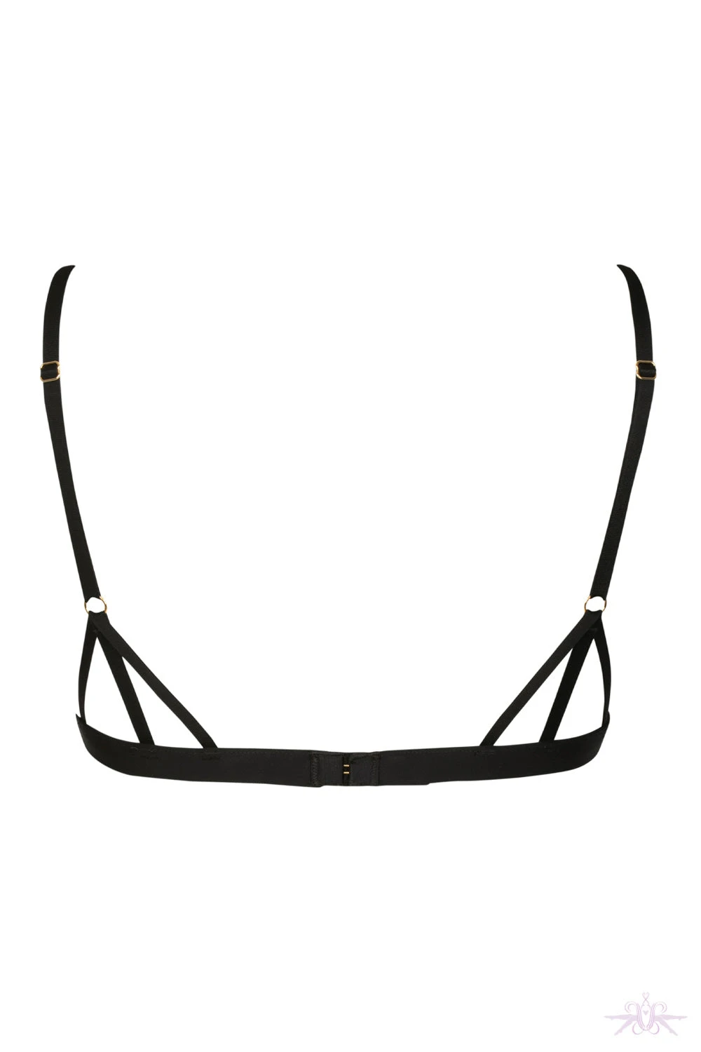 A seductive soft lace triangle bra from Atelier Amour which accentuates the bust. The graphic lace cups cut on the breast which allows you to reveal when desire. Golden chain jewellery adorns the front. Adjustable shoulder straps and soft elastic allows for a perfect and comfortable fit. Matching items are also available.