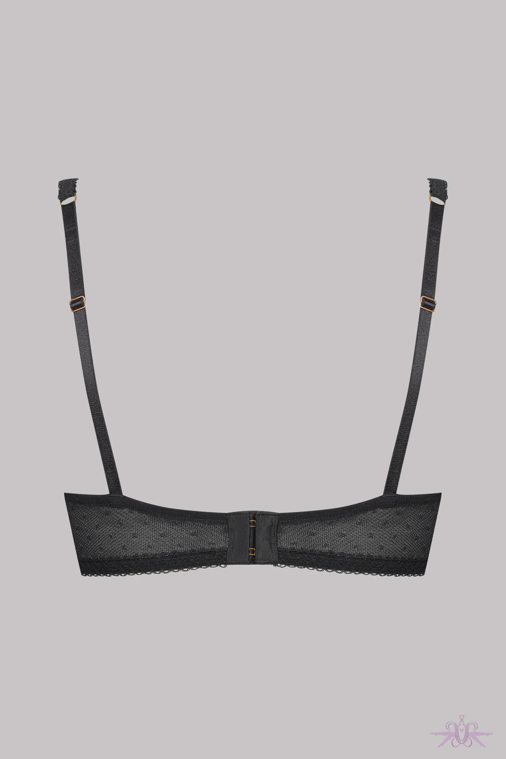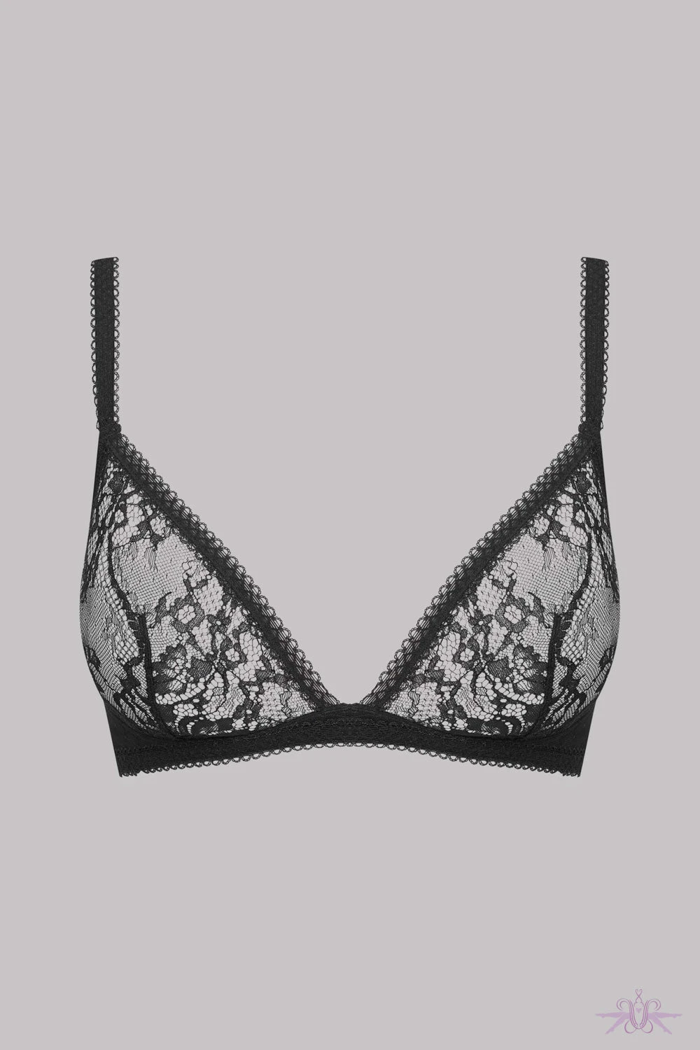 Feminine and chic is this gorgeous triangle bra from the Inspiration Divine collection. The soft and stretchable fabric on the triangular cups shapes the breast beautifully. It is so comfy as it doesn’t have underwire or any rigid materials, it is simply modern and elegant. A sumptuous transparent floral lace reveals your assets. Finish the look with the matching mini or openable thong and harness.Â