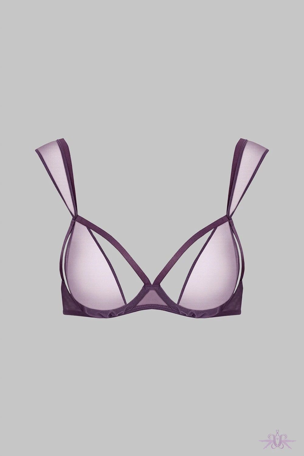 An extremely seductive naked breast scarf bra in sheer violet orchid mesh. It is underwired enhancing the bust. The mesh scarf to tie as you wish: around neck to drape nicely over the breasts or in back for a naked breast look.