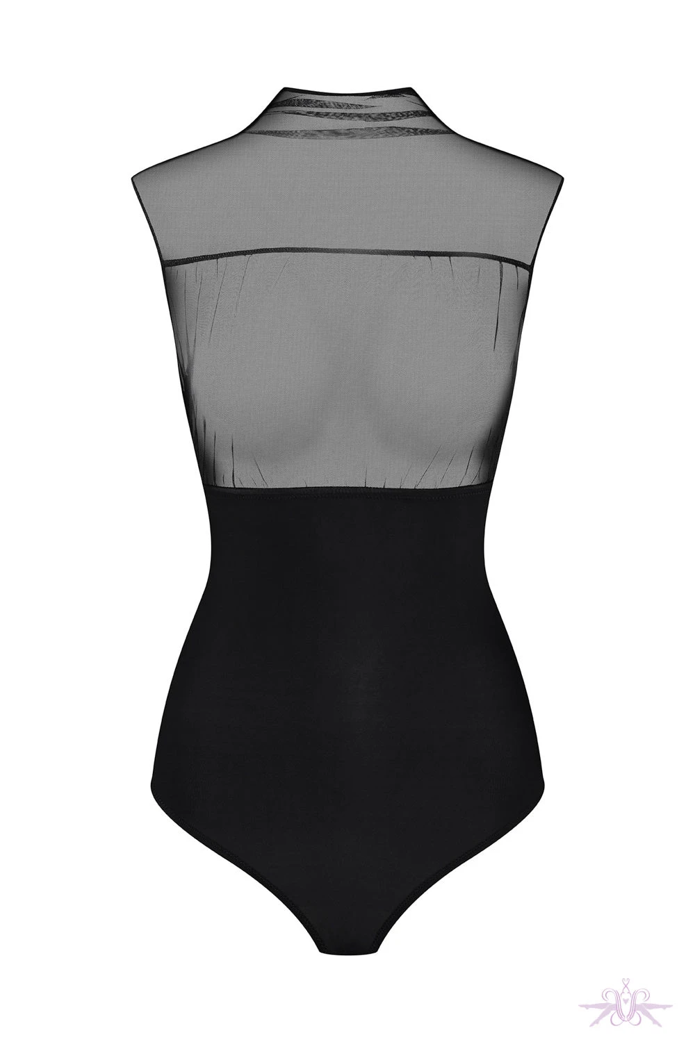 A luxurious bodysuit from the Madame Reve collection at Maison Close, made with a delightful mix of fabrics. The transparent mesh top delicately reveals the bust and the remainder fits the body like a second skin with its opaque and soft microfiber. The sheer back is enhanced by the deep neckline whilst the collar finishes the look with its opaque microfiber scarf to tie. This bodysuit is gorgeous as lingerie or so classy as a seductive top as outerwear.