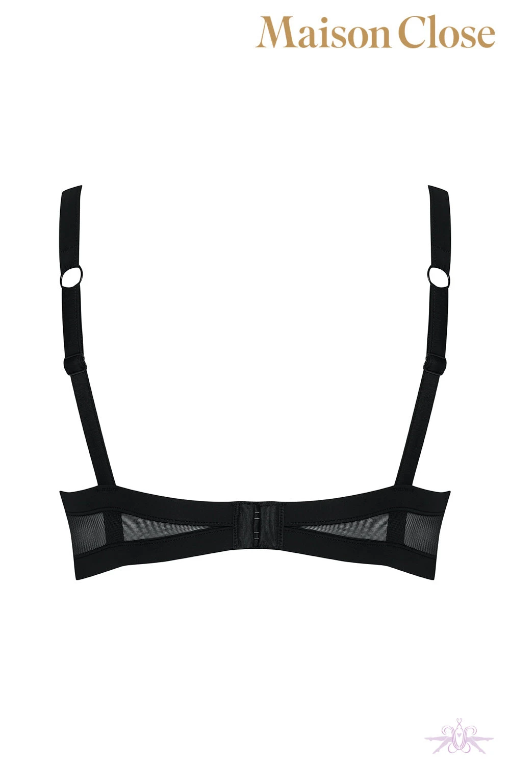 Daring and suggestive is the naked breast bra from Maison Close. It features a naked breast cut offering audacity and support. This seductive underwear is incredibly soft with its extraordinary refinement. A semi-transparent tulle panel decorates the edging and the adjustable straps ensure a good fit. To increase desire wear with the matching high hips thong and garter belt.