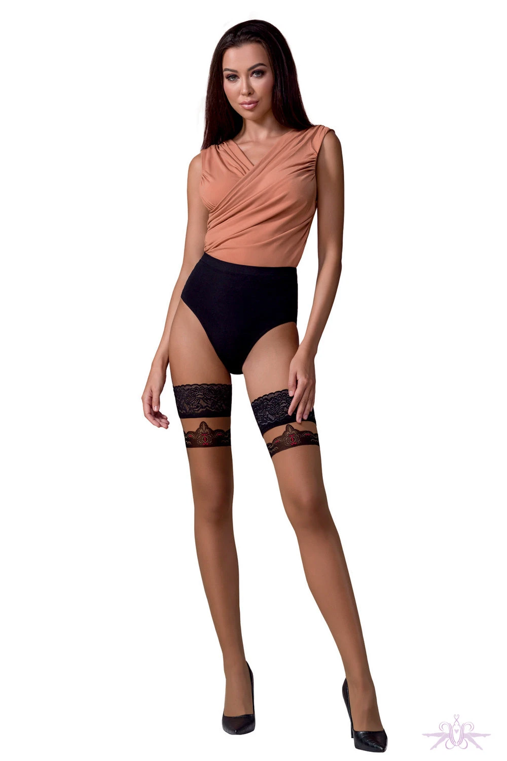 A beautiful pair of beige hold ups with a black seam from Passion. These have a decorative motif to the top in black and red along with a gorgeous lace top band. They are manufactured with a large content of LYCRA and have reinforced toes. Also available in white/blue.